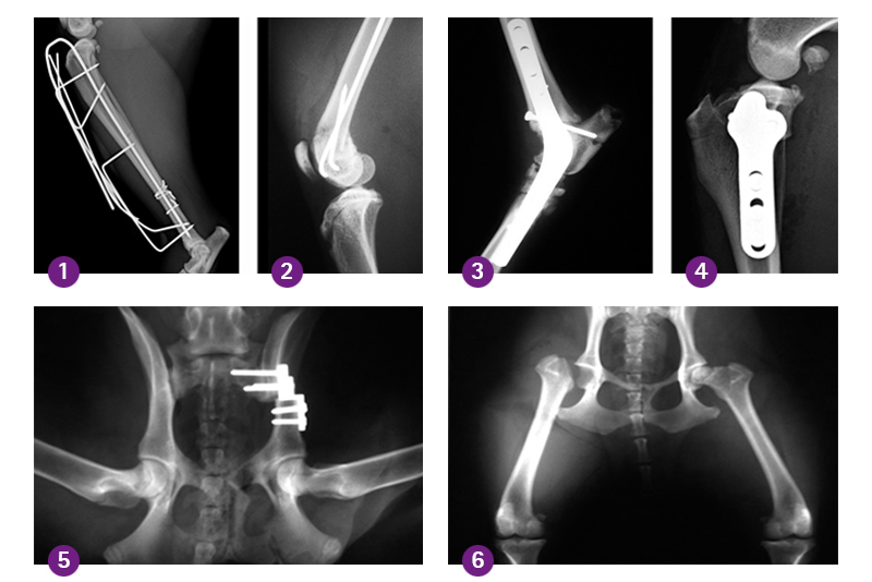 (1) Tibiafraktur mit Fixateur externe (2) Supracondyläre Femurfraktur (3) Pantarsale Arthrodese (4) TPLO (5) TPO (6) FKHR